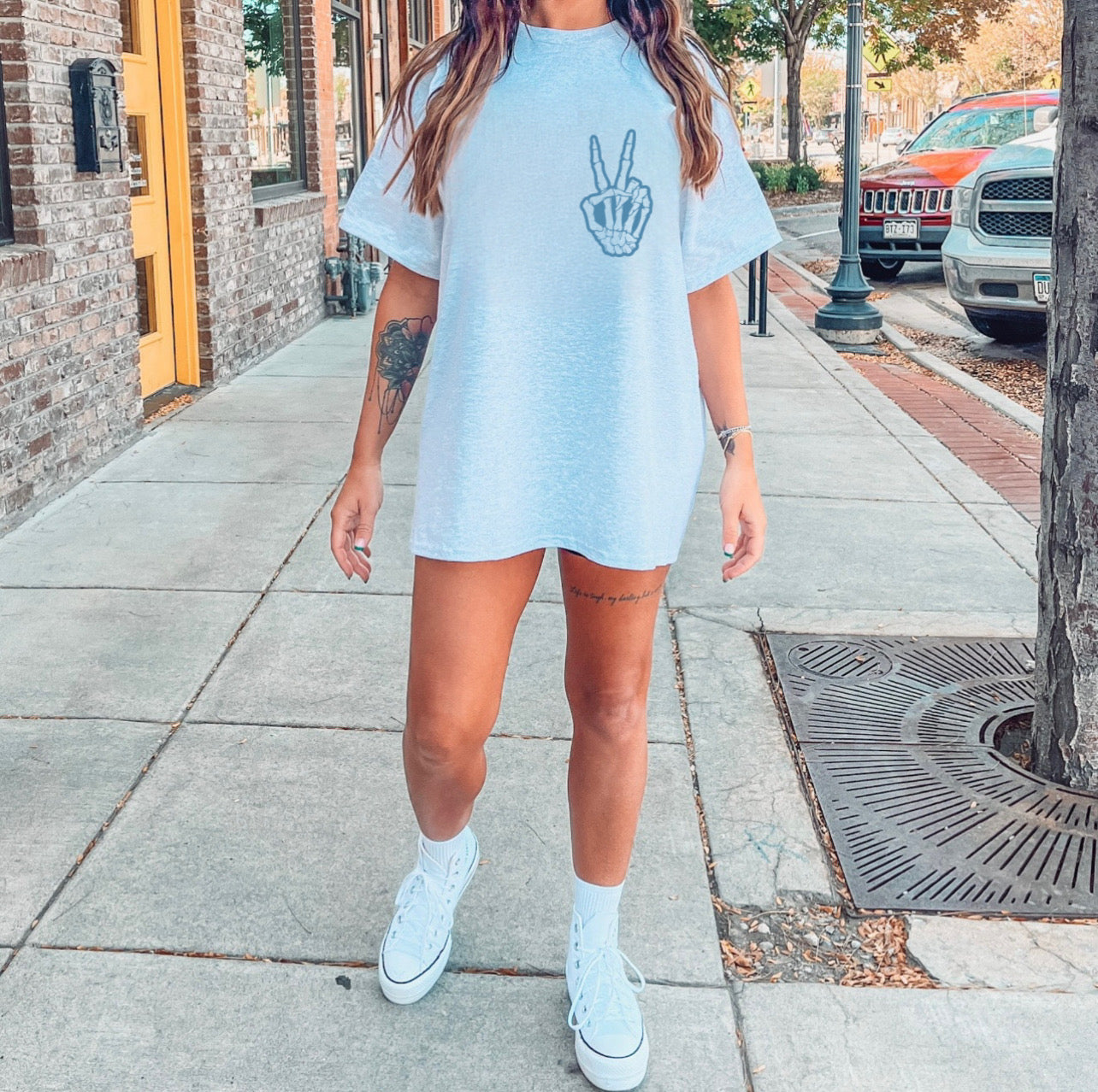 We recommend sizing up for a more oversized look like the model!
